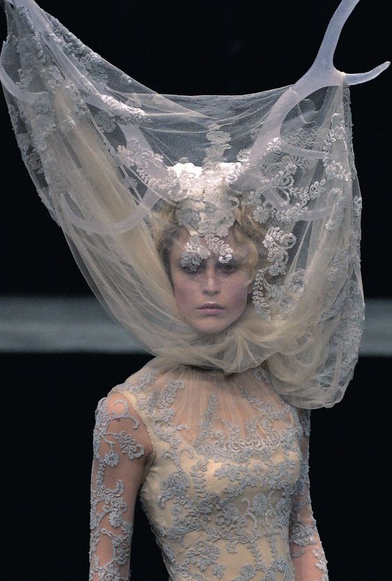 Raquel Zimmerman in a tulle and lace dress with veil and antlers, Alexander McQueen's 'Widows of Culloden', A/W 2006